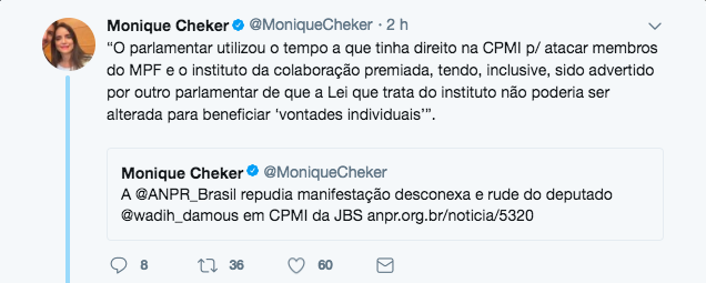Monique Cheker, procuradora da República em Petrópolis/RJ e ativista do Ministério Público nas redes sociais, amiga de Deltan Dallagnol, sugeriu no Twitter que ministros do STF “ganham por fora com os companheiros que beneficiam” e não têm “vergonha na cara”.
